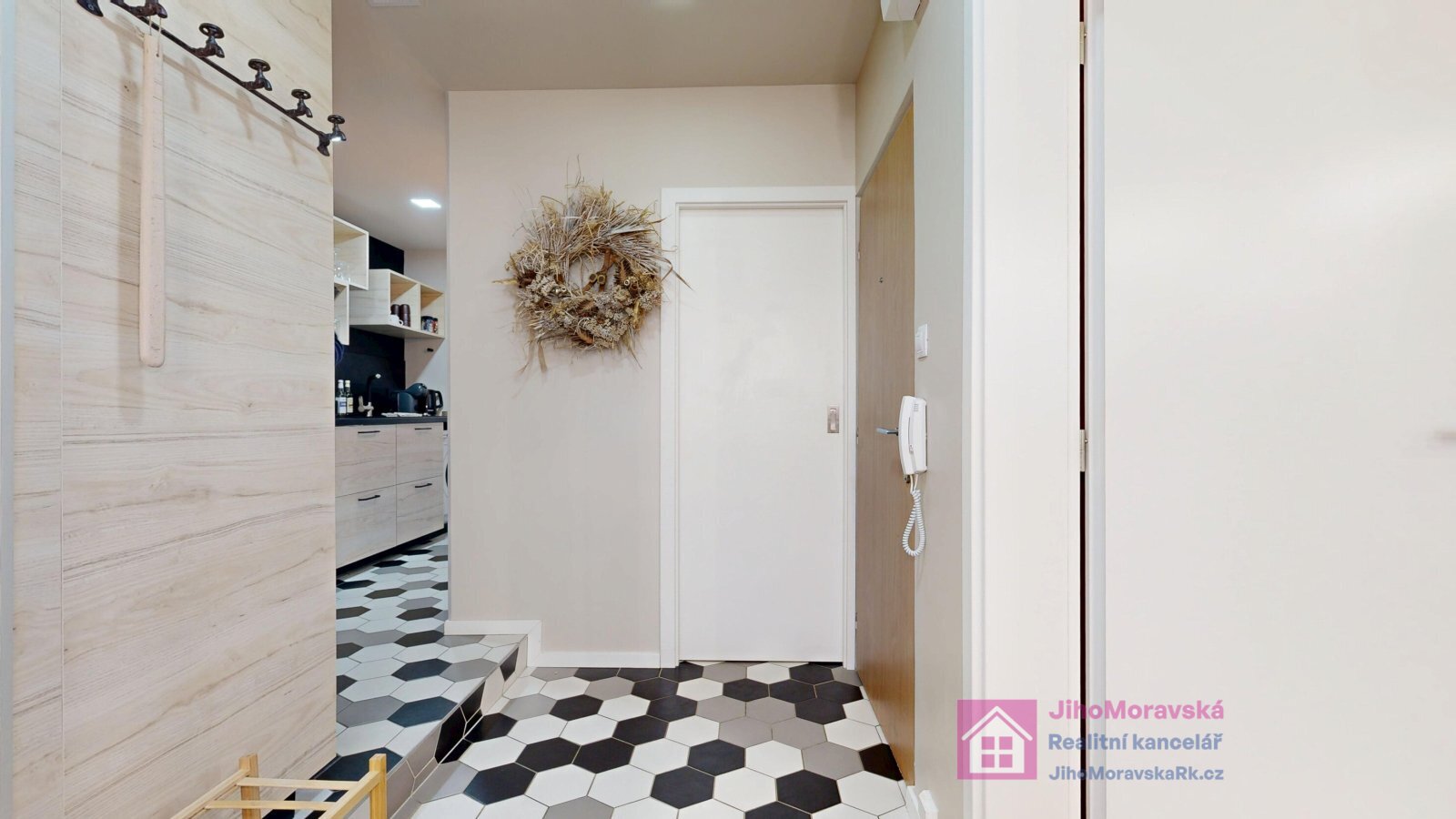 Dispozice bytu: chodba, koupelna s toaletou a sprchovým koutem, kuchyňský kout s vestavěnými spotřebiči,