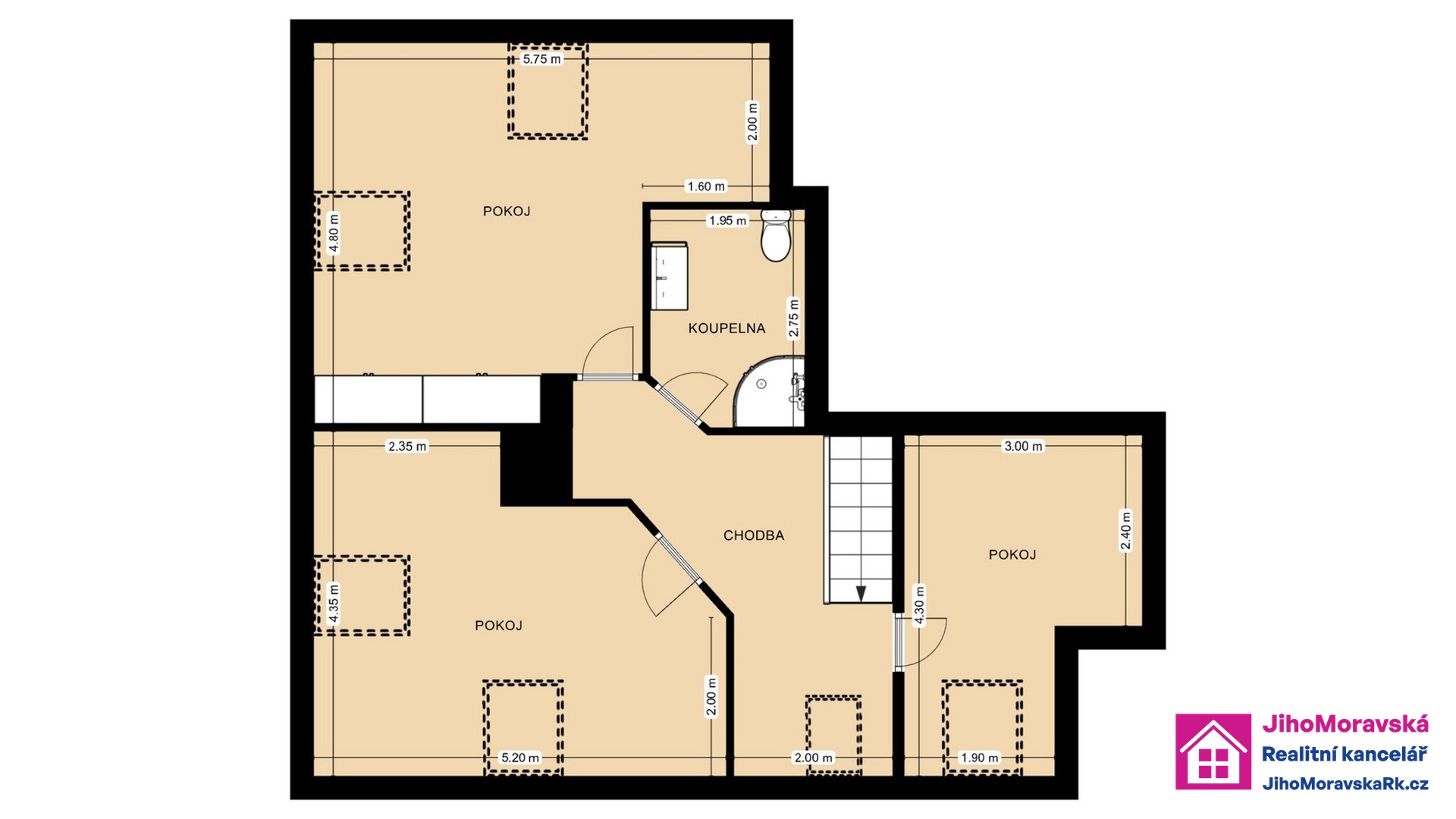 Dispozice: přízemí: předsíň, koupelna s vanou, chodba, toaleta, pokoj, kuchyň a lodžie podkroví: schodiště, chodba, tři pokoje a koupelna (sprchový kout) s WC.Půdorysy obou podlaží bytu naleznete ve fotogalerii.