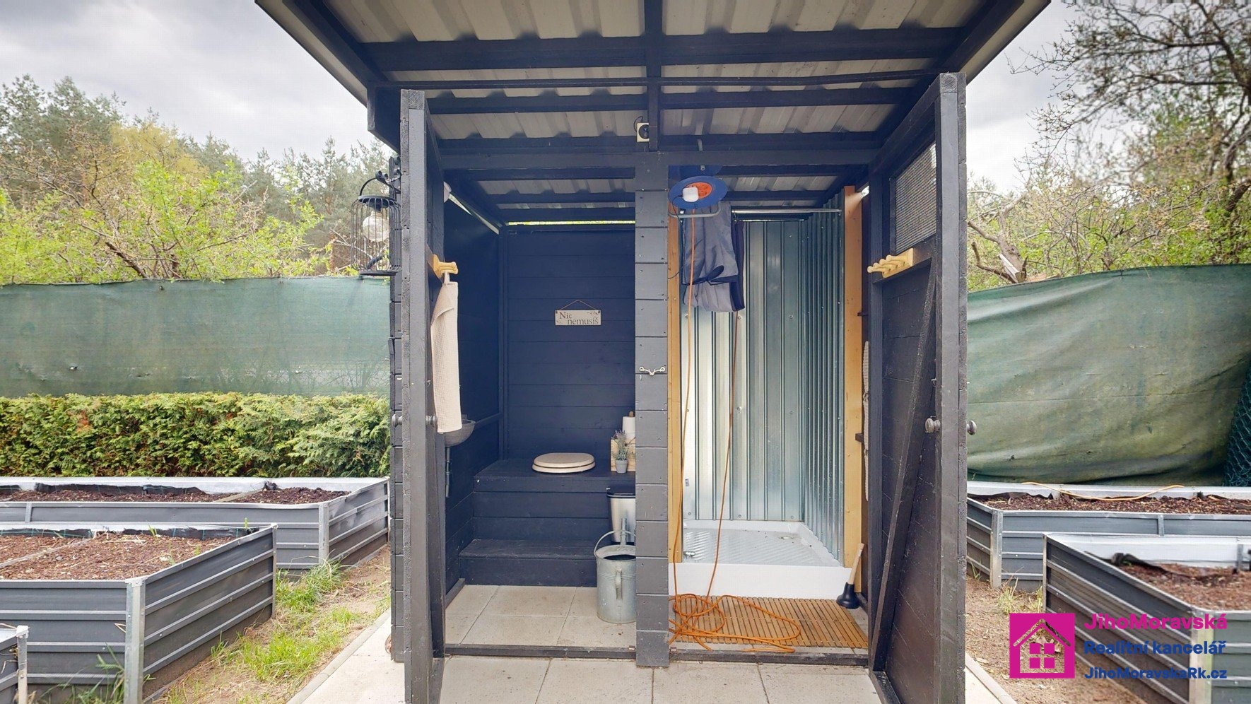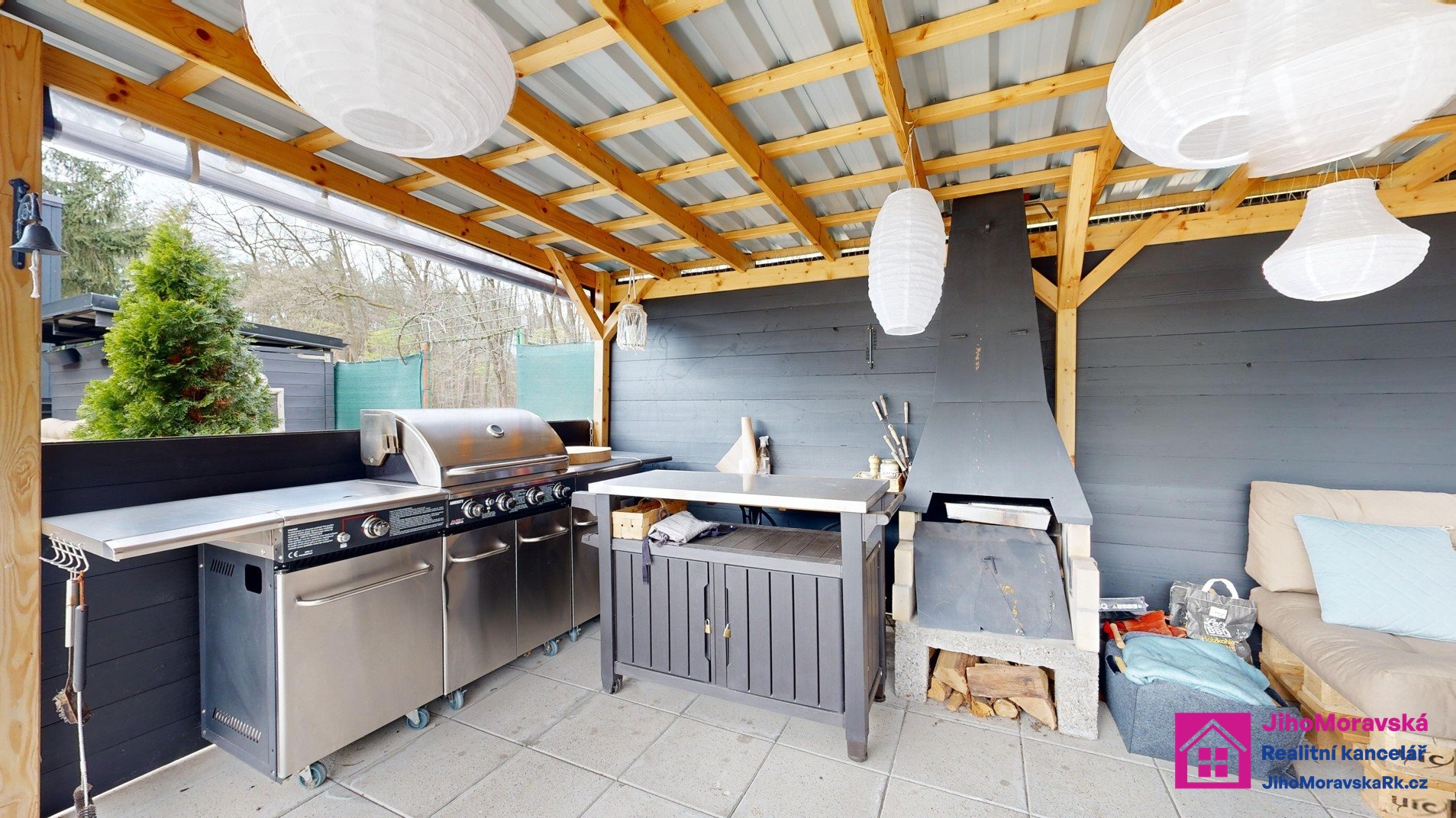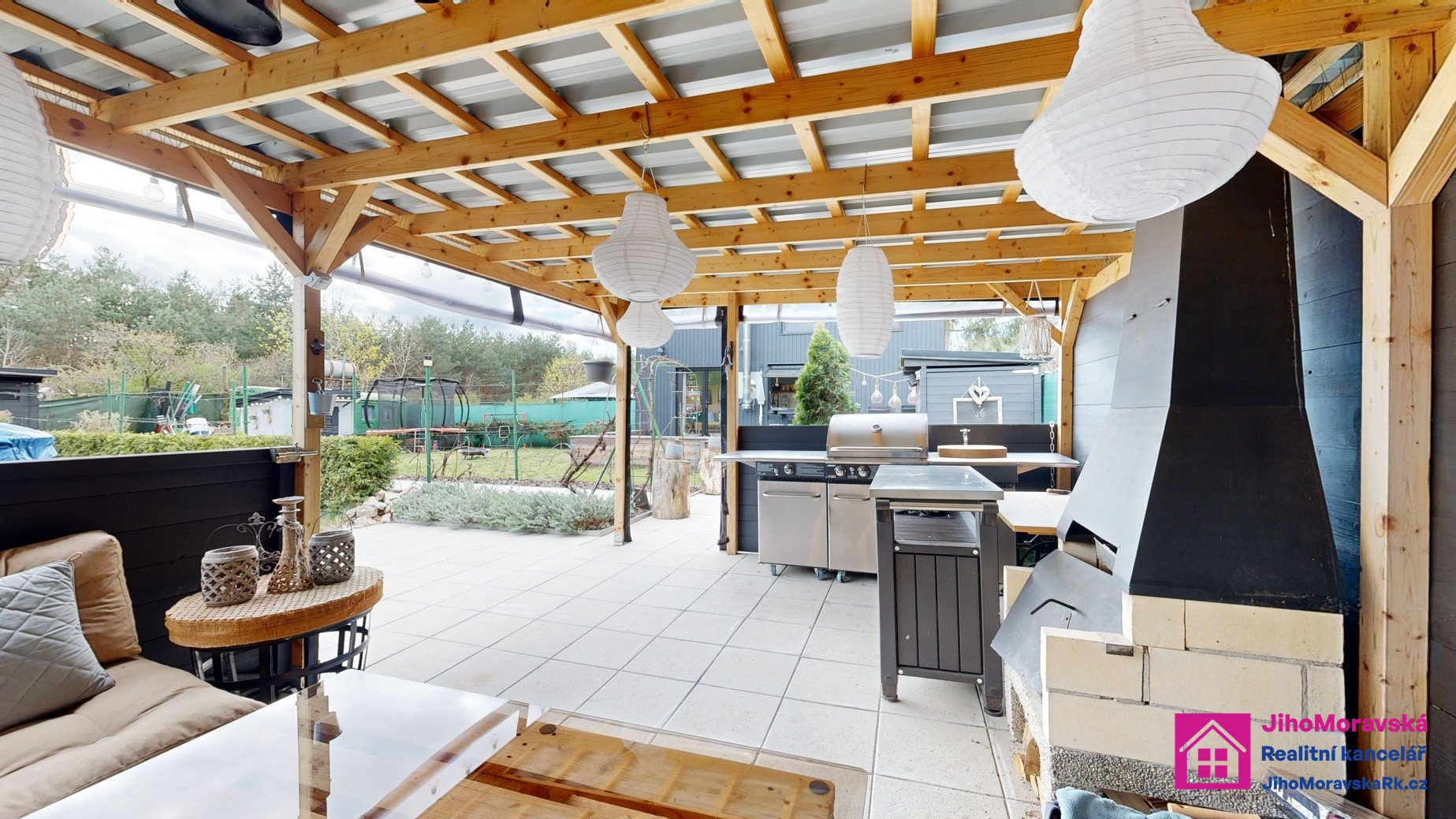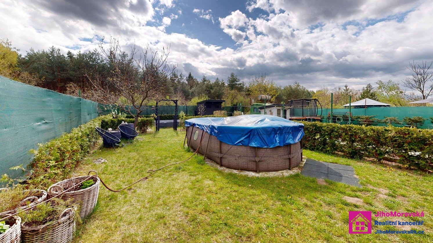 Součástí prodejní ceny je následující vybavení: Pergola s krbem a zástěnami s paletovým posezením, matracemi, stolem z palet a skla. Dvě venkovní boudy. V první je úschovna na kola plus malý sklep a ve druhé keramické wc, kamenné umyvadlo a sprchový kout na solární sprchu. Zelená maringotka pro úschovu nářadí atd. 5x vyvýšené záhony, nadzemní bazén s příslušenstvím, trampolína, dětský domeček s terasou. Velká terasa s levandulemi, stůl a paletové posezení s matrací a šicím strojem na boty jako stoleček. Veškeré solární osvětlení zahrady a dva bečáry na dešťovou vodu.