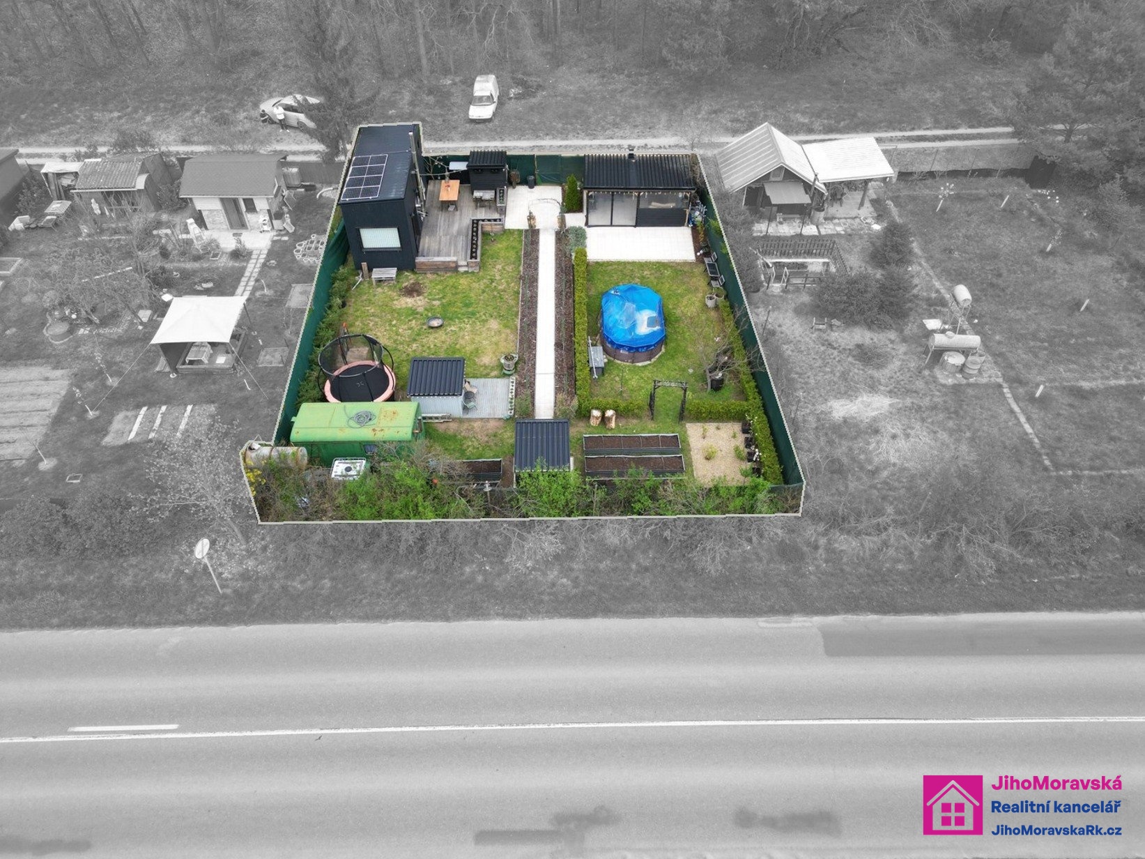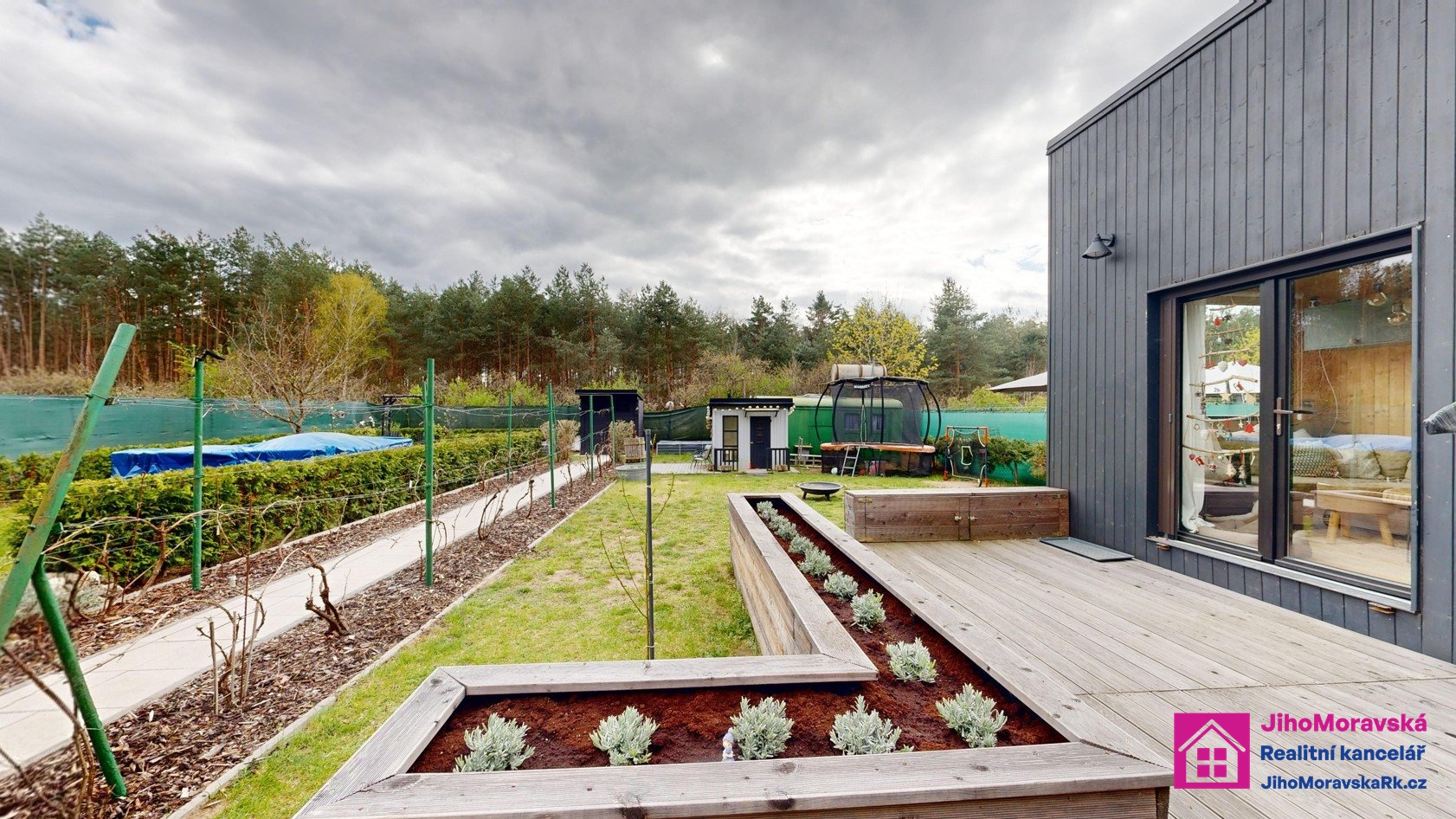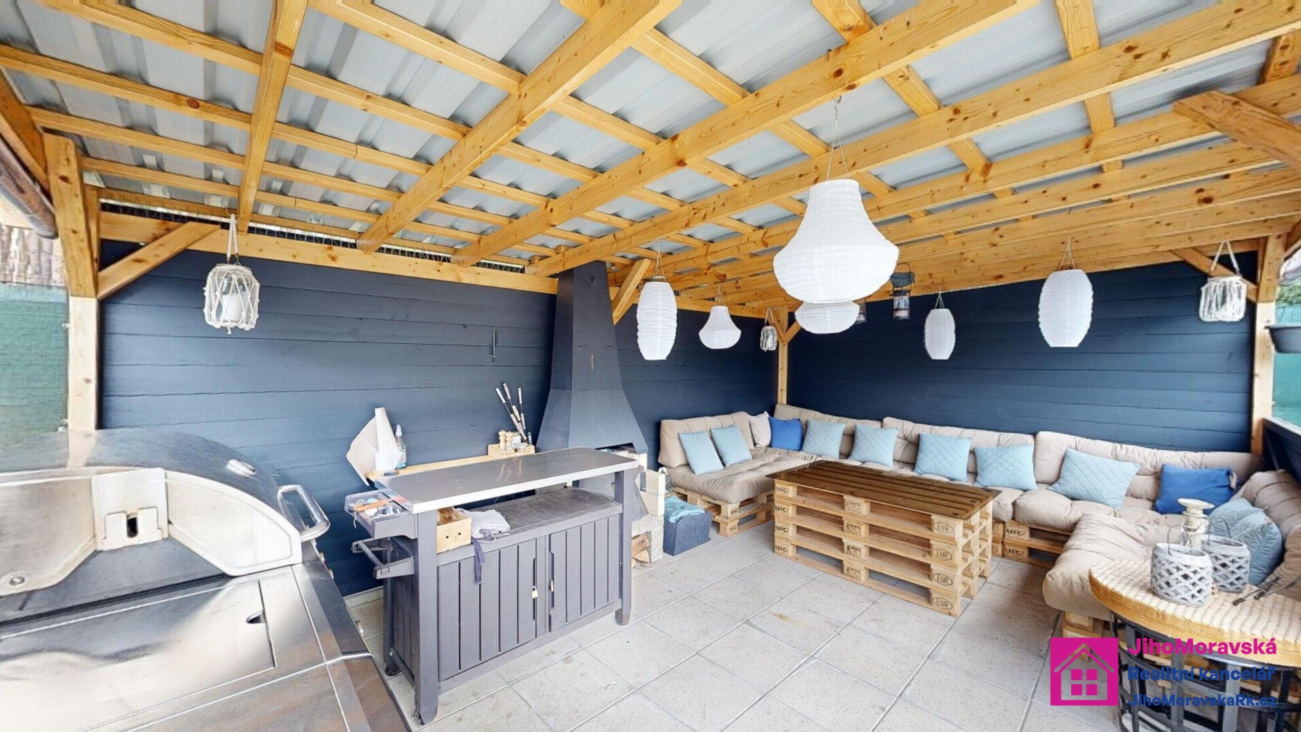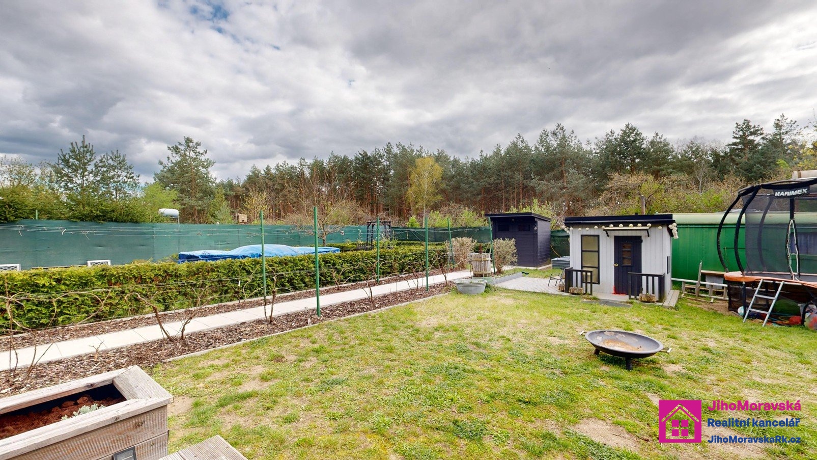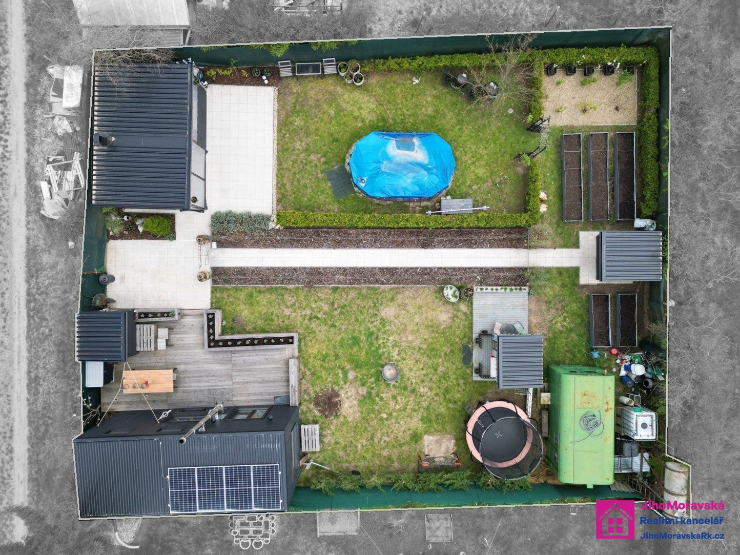 Součástí prodejní ceny je následující vybavení: Pergola s krbem a zástěnami s paletovým posezením, matracemi, stolem z palet a skla. Dvě venkovní boudy. V první je úschovna na kola plus malý sklep a ve druhé keramické wc, kamenné umyvadlo a sprchový kout na solární sprchu. Zelená maringotka pro úschovu nářadí atd. 5x vyvýšené záhony, nadzemní bazén s příslušenstvím, trampolína, dětský domeček s terasou. Velká terasa s levandulemi, stůl a paletové posezení s matrací a šicím strojem na boty jako stoleček. Veškeré solární osvětlení zahrady a dva bečáry na dešťovou vodu.