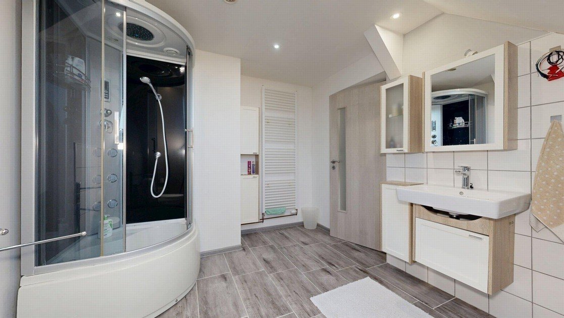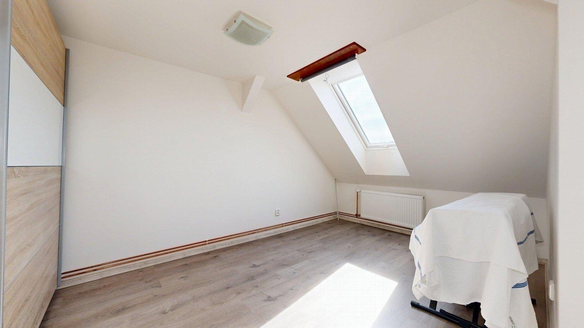 2.nadzemní podlaží: schodiště, chodba, sklad, koupena (WC a sprchový kout) a tři průchozí pokoje. Půdorysy všech podlaží domu naleznete ve fotogalerii.