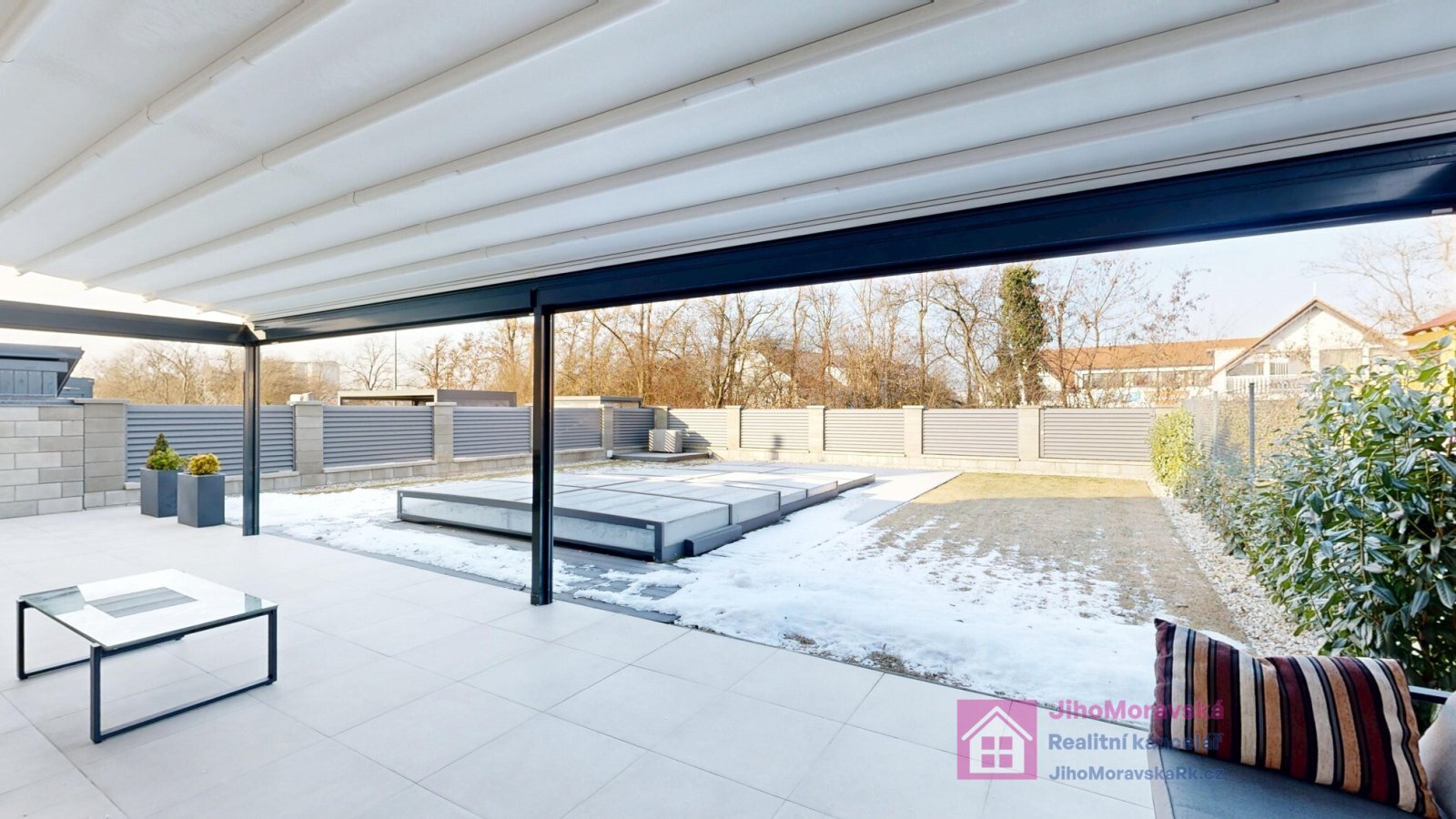 Venkovní bazén se slanou vodou, pískovou filtrací, zastřešení s elektrickým ovládáním a vyhříváním vody pomocí tepelného čerpadla.