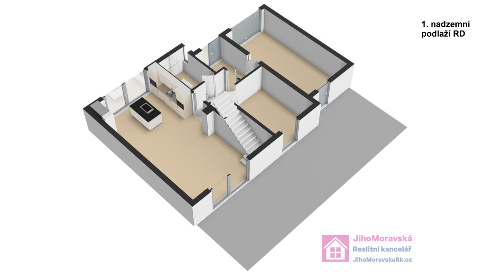 1. nadzemní podlaží: garáž (průchozí do domu i na zahradu), předsíň, chodba, pokoj, koupelna s WC (sprchový kout), pokoj s kuchyňským koutem, jídelnou a schodištěm do 2. nadzemního podlaží.