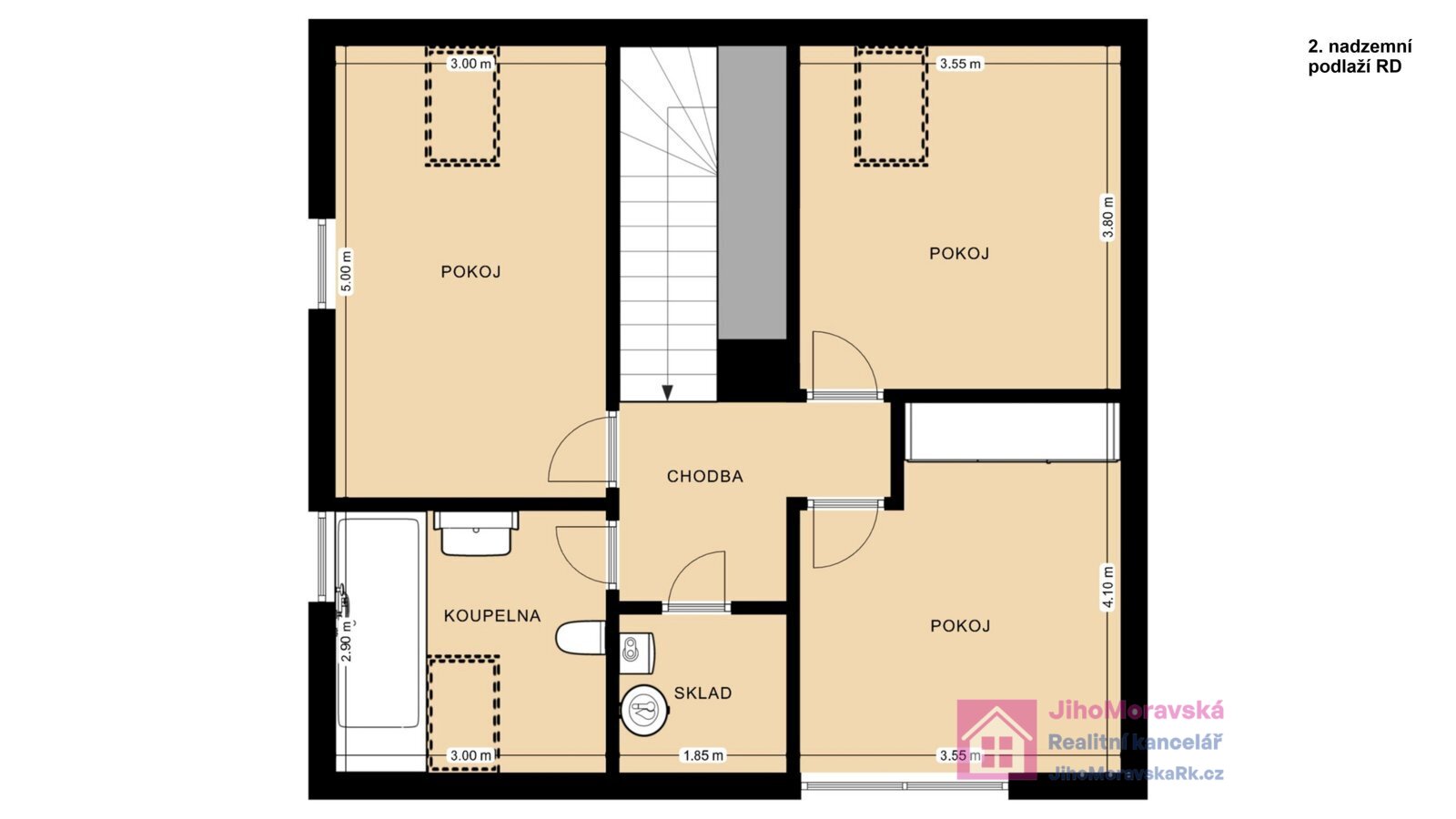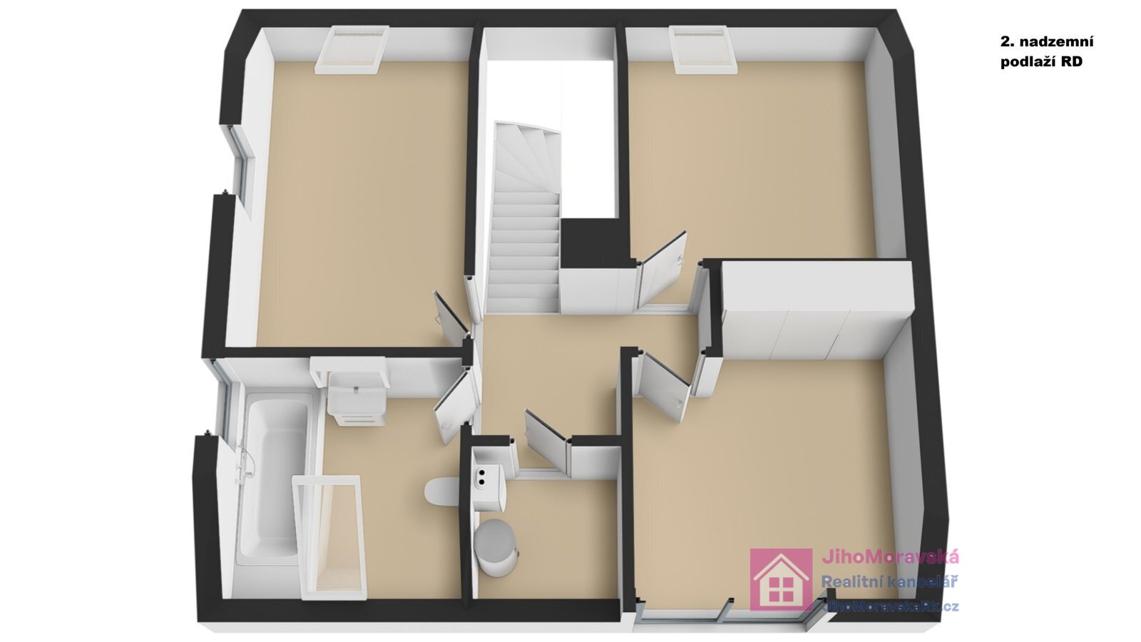 2. nadzemní podlaží: chodba, technická místnost s pračkou a sušičkou tři samostatné pokoje a koupelna (vana) s WC. Přímý vstup z terasy do pracovny a obývacího pokoje.