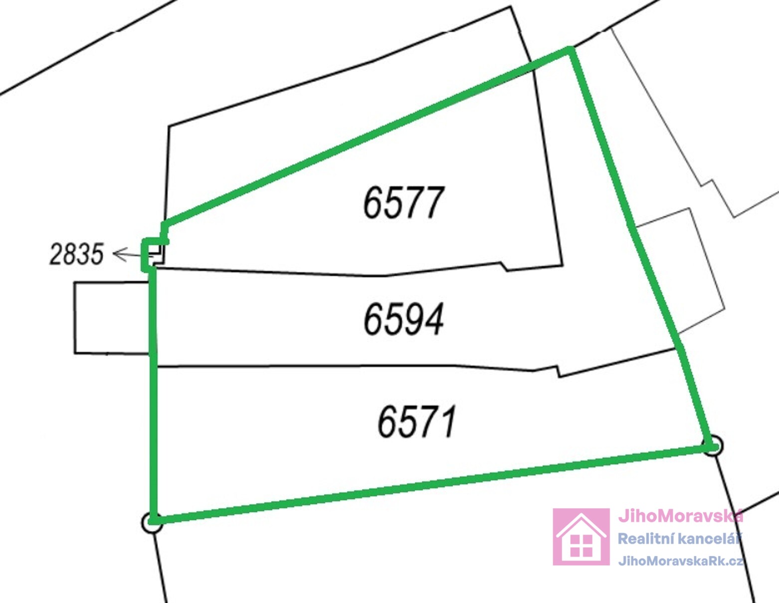 Pozemek se skládá ze čtyř parcel. Parcelní čísla 6577, 6594, 6571 a St. 2735, vše zapsáno v katastrálním území Velké Bílovice.
