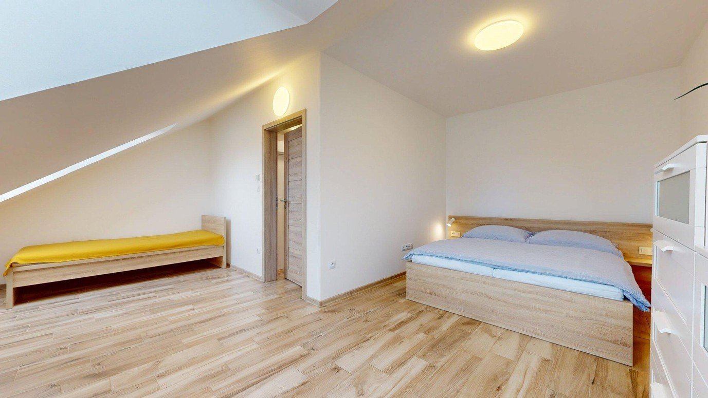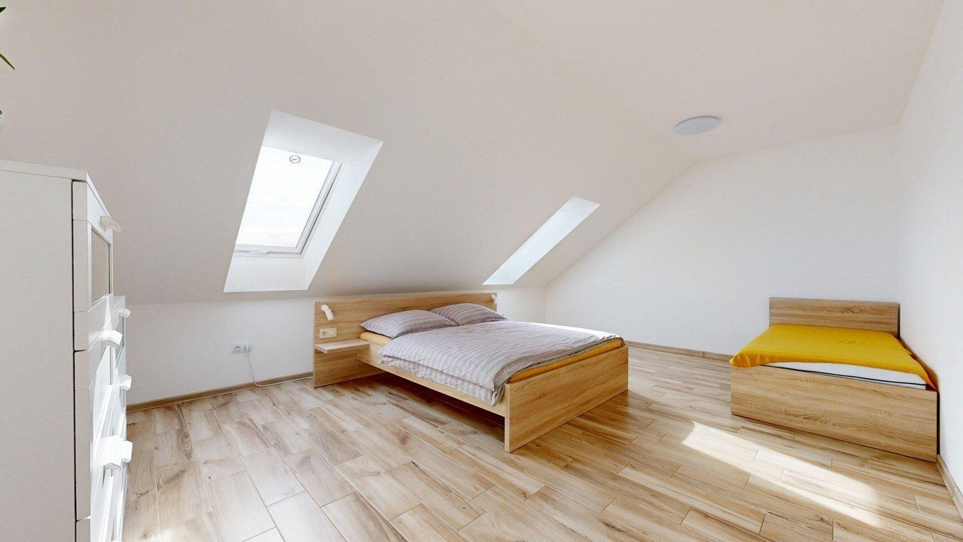 podkroví: schodiště, chodba a dva pokoje