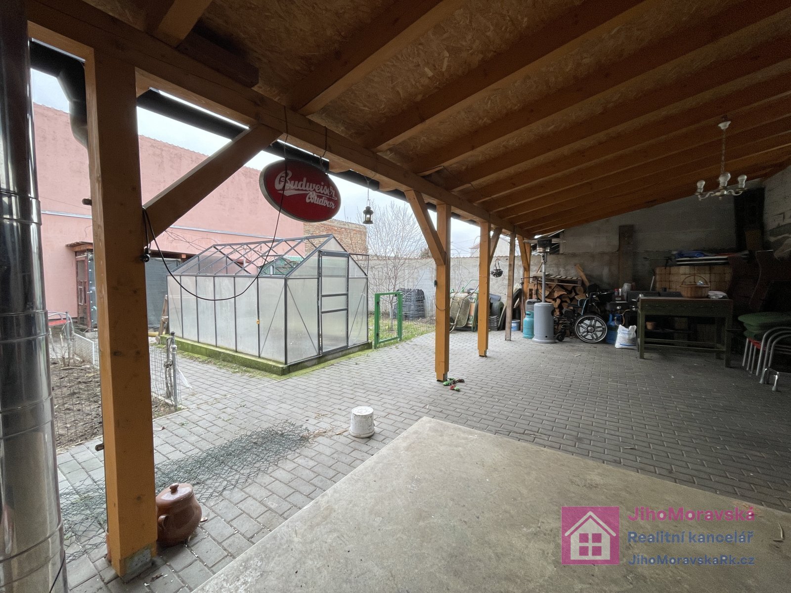 Na dvoře je záhonek se skleníkem a krytá terasa.